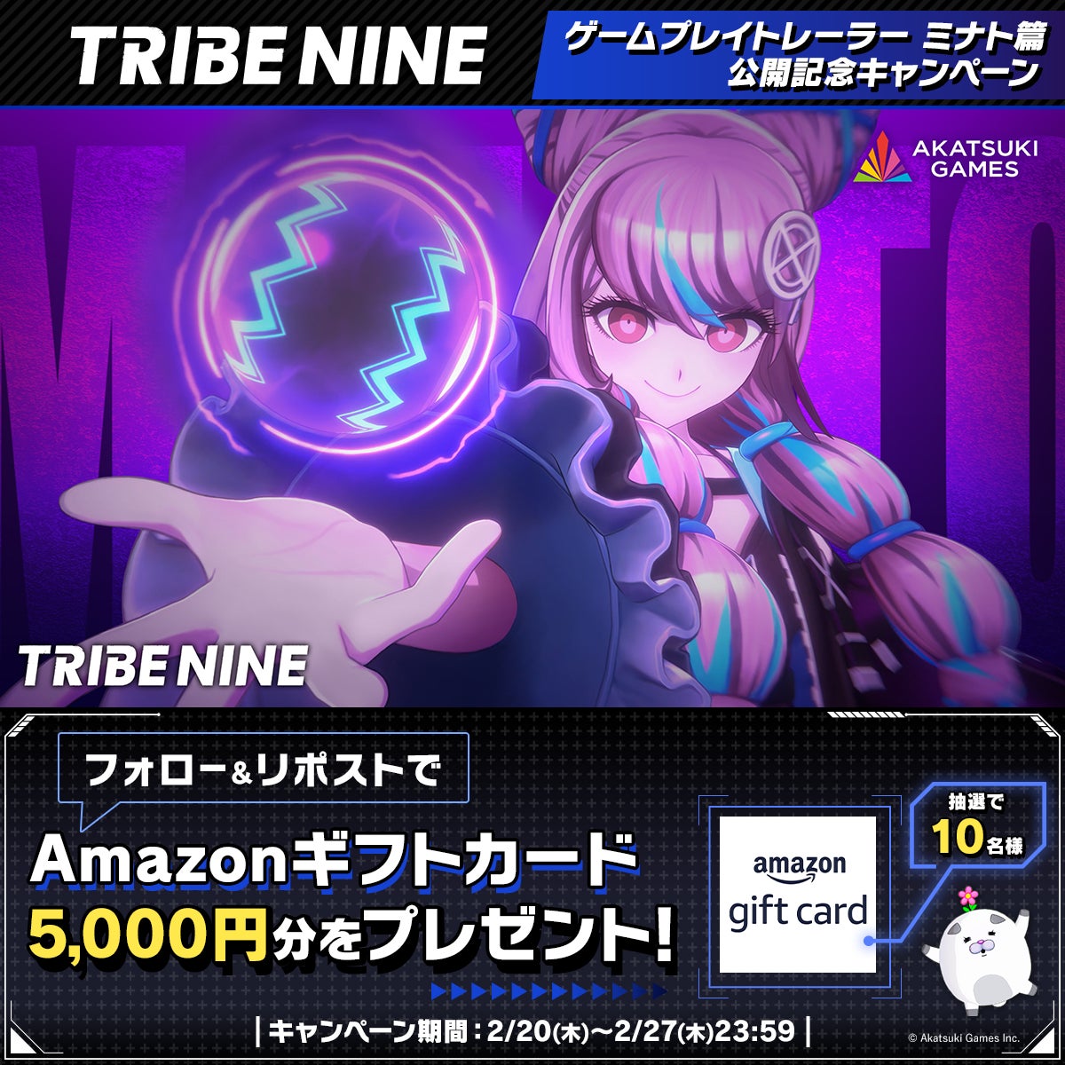 「ゲームプレイトレーラー ミナト篇」の公開を記念して、『トライブナイン』公式X(@tribenine_tokyo)にて、抽選で10名様にAmazonギフトカード5,000円分が当たるフォロー&リポストキャンペーンを開催中です。
