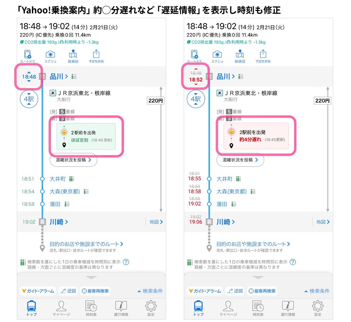 乗車予定の列車が時間通りに運行している場合は「ほぼ定刻」、遅延している場合は「約〇分遅れ」と表示されます。遅延している場合、消去線が引かれた予定発着時刻の下に赤色で遅延時の発着時刻が表示され、遅延時分を一目で確認できます。