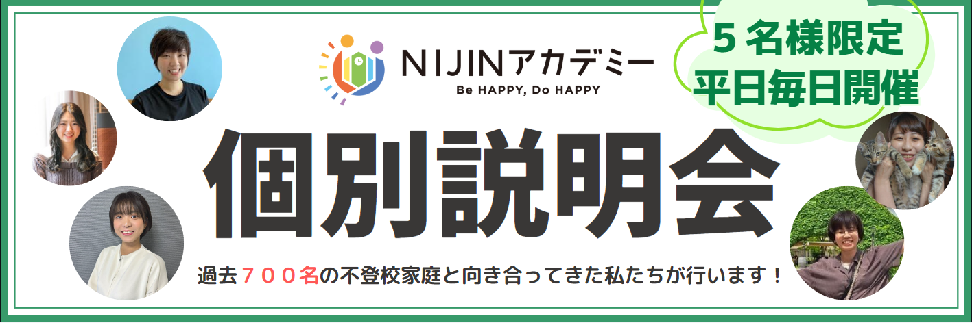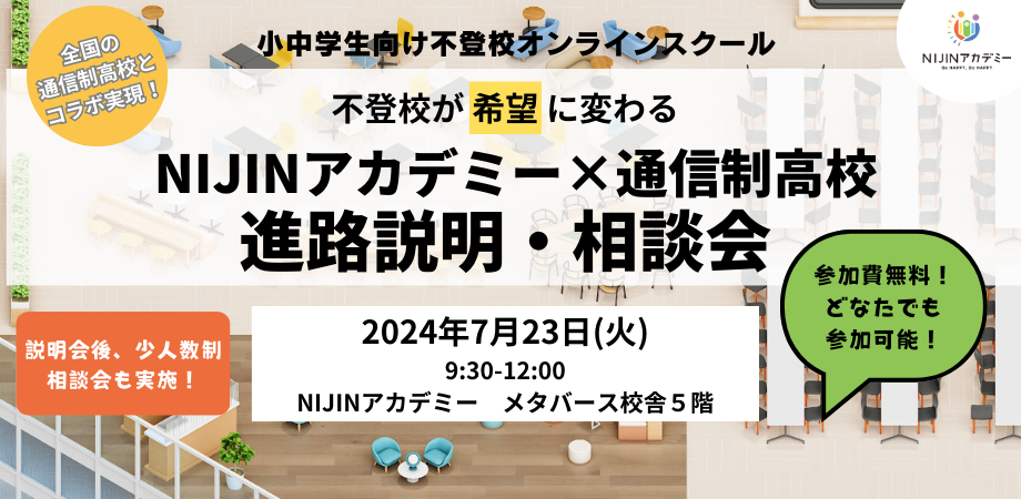 NIJINアカデミーは、不登校の小中学生が未来に向けた希望を持ち、自らの夢の実現に向けた第一歩を踏み出すサポートを行っています。本イベントは、進路選択に悩む生徒や保護者に対し、様々な進路情報を提供し、将来の選択肢を広げることを目的としています。
