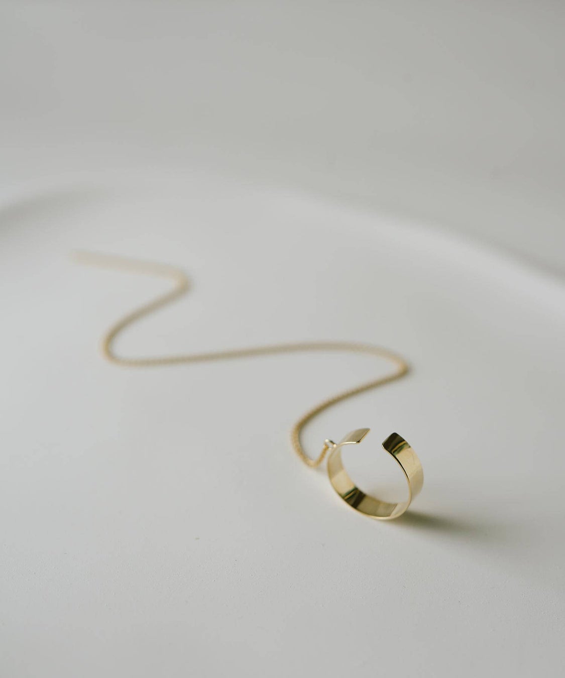 シンプルながらも洗練されたデザインが耳元を美しく彩るフラットフープのイヤーカフが登場しました。K10ゴールドのフラットフープが持つ艶やかな輝きと、繊細に揺れるチェーンの組み合わせが、動くたびに華やかな印象を与えます。