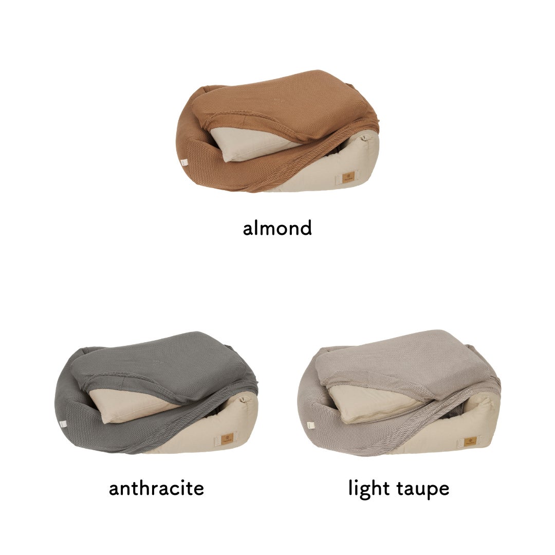 オーガニックコットン×リサイクル素材のやさしい生地は、愛犬の肌にも人の手にも心地よい質感。洗濯機で丸ごと洗える丈夫な生地設計で、季節を問わず快適に使える仕様です。インテリアにも溶け込むナチュラルカラーで、快適さと清潔さを両立したサステナブルな犬用ベッドシーツです。