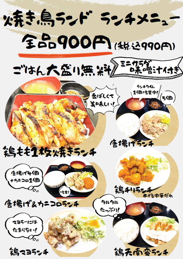 焼き鳥ランドでお得なランチがスタート。全品900円でお得に本格的な鶏料理をお楽しみいただけます。ご飯大盛無料。ミニサラダ、お味噌汁付き!!