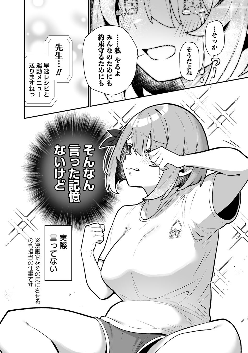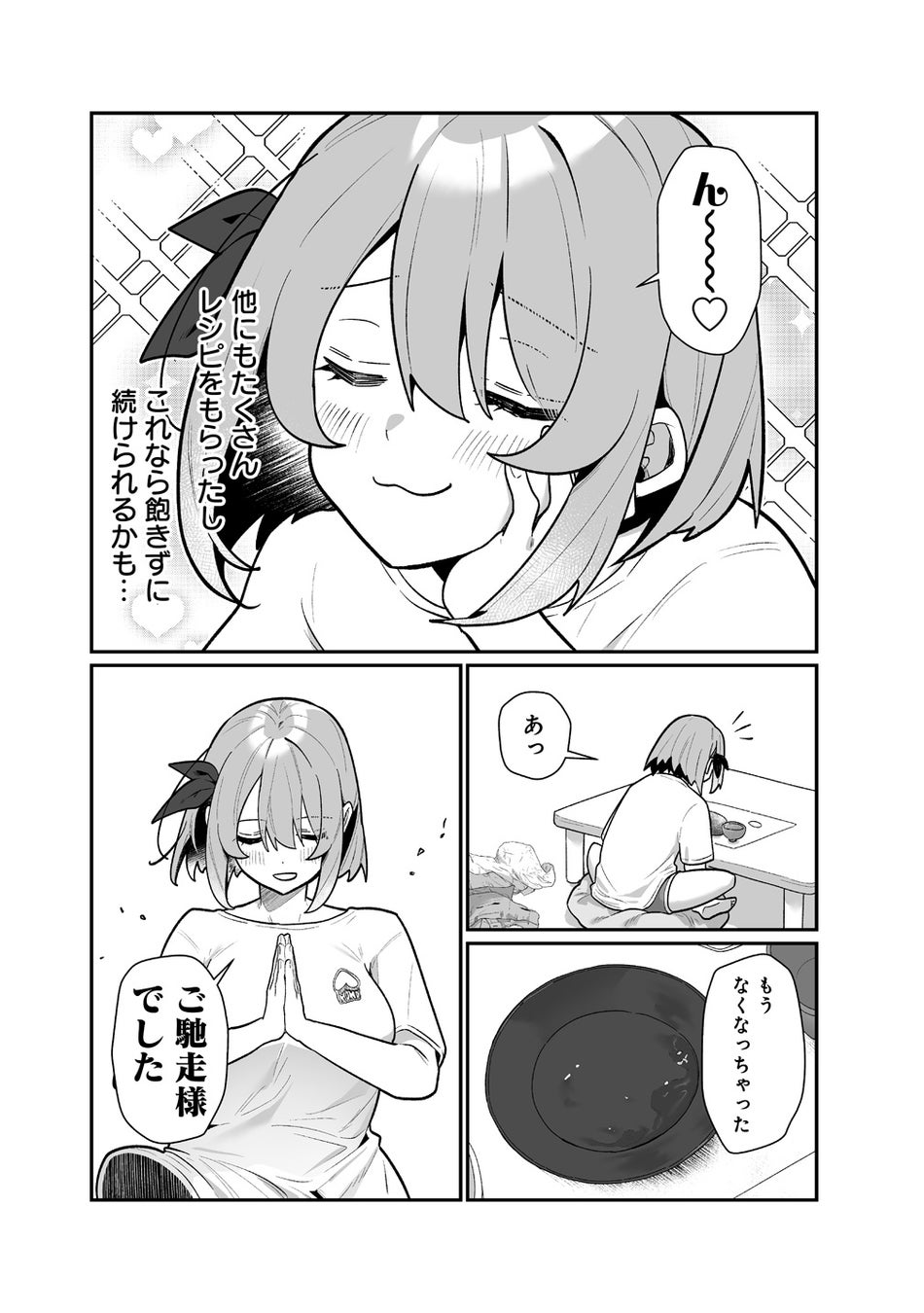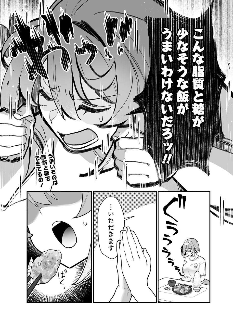 「食の楽しみを奪われるくらいなら死ぬ」と断言する彼女だったが、担当編集の提案で満腹感のあるおいしい高タンパク料理に挑戦することになる。
