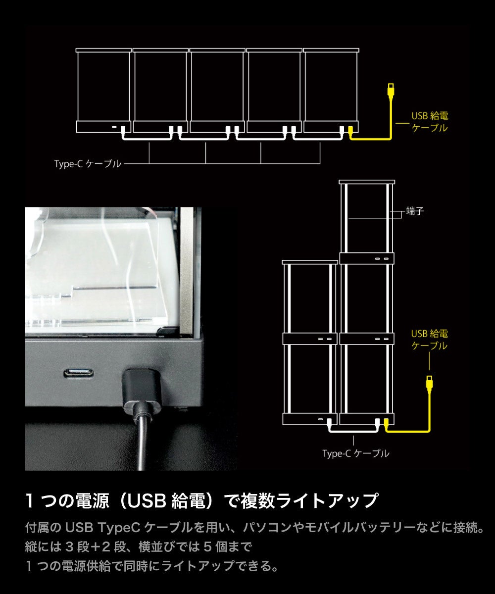 USBより給電。連結機能を搭載し最大5個まで1つの電源で同時に使用が可能。天板部を外し、縦に重ねることも可能(最大3個)。
