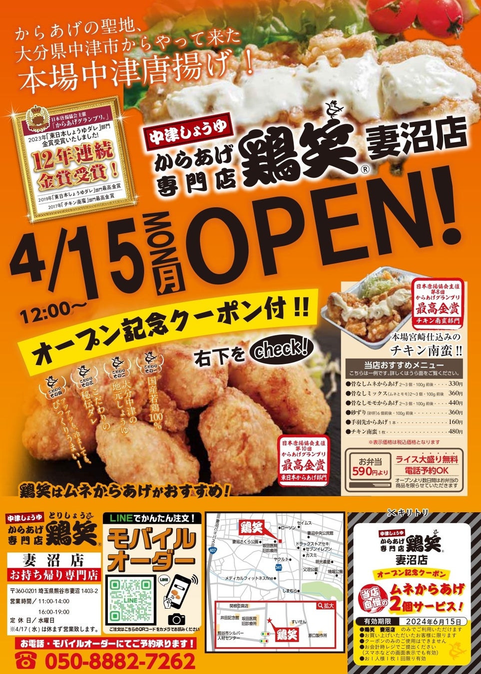 からあげ専門店「鶏笑 妻沼店」2024年4月15日(月)オープン!