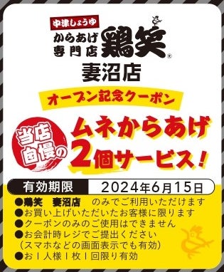 鶏笑 妻沼店のオープンを記念して、妻沼店限定で「ムネからあげ2個」がもらえるクーポン券を、数量限定で店頭などでお配りしています。以下のクーポン画像をスマートフォン等でご提示いただいても有効です。皆様のご来店をお待ちしております!