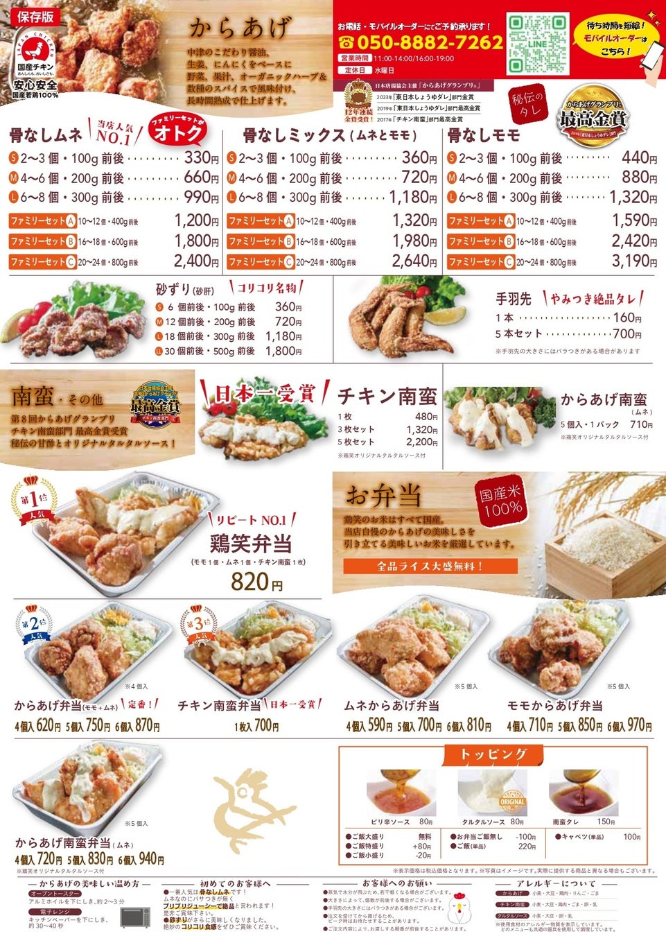 この度オープンいたします「鶏笑 妻沼店」は、妻沼下町バス停(朝日バス)から徒歩約1分のところにあります。ご注文は以下のURLかお電話から事前にご連絡いただければ、お待たせすることなく商品をお渡しできます。昼食のお弁当、晩御飯のおかずやお酒のおつまみなど、毎日のお食事の中で、最高金賞受賞のからあげのおいしさをご堪能下さい。