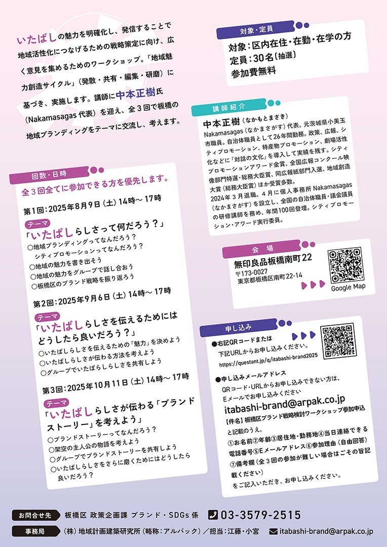 板橋区は、新しい「板橋区ブランド戦略」に広く区民の方等のアイデアやご意見を取り入れるため、令和7年8月から10月にかけて実施する区民向けワークショップの参加者を募集しています。要事前申込、7月31日(木曜日)まで。
