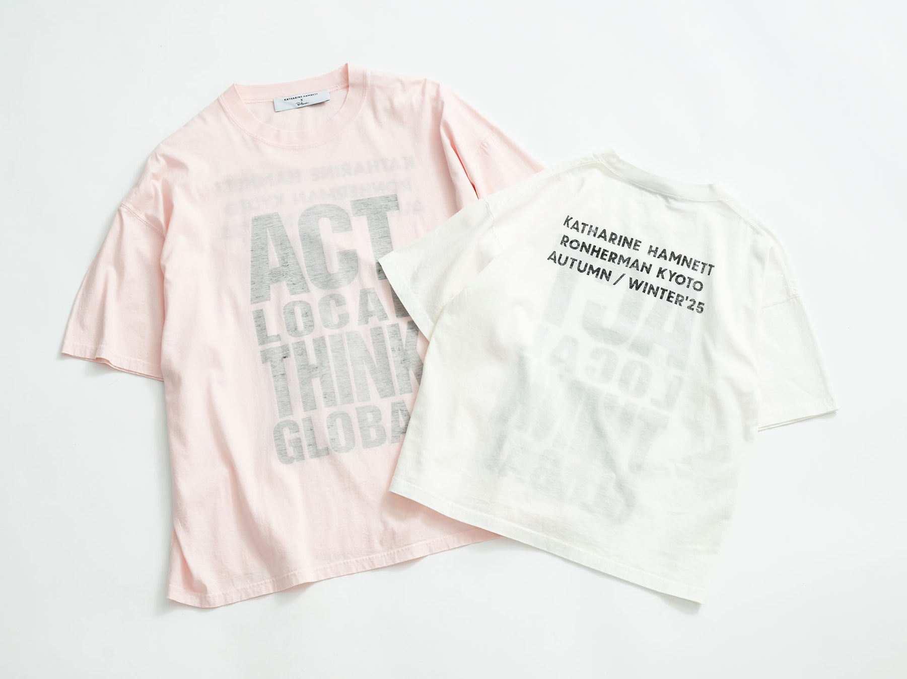 毎シーズン大人気のキャサリン ハムネットとの別注コレクション。今回はロンハーマン京都店10周年を記念して特別なTシャツが登場します。古都京都に相応しいスローガン”act local think global”「地域社会で行動を起こし、世界規模でものを考えよう」を選び、さらにバックにはKYOTOのプリントを施しました。店舗名がプリントされるのは今回が初めてとなり、より一層特別感を演出します。さらに、同じデザインのキッズサイズも展開するため親子で楽しめるアイテムです。