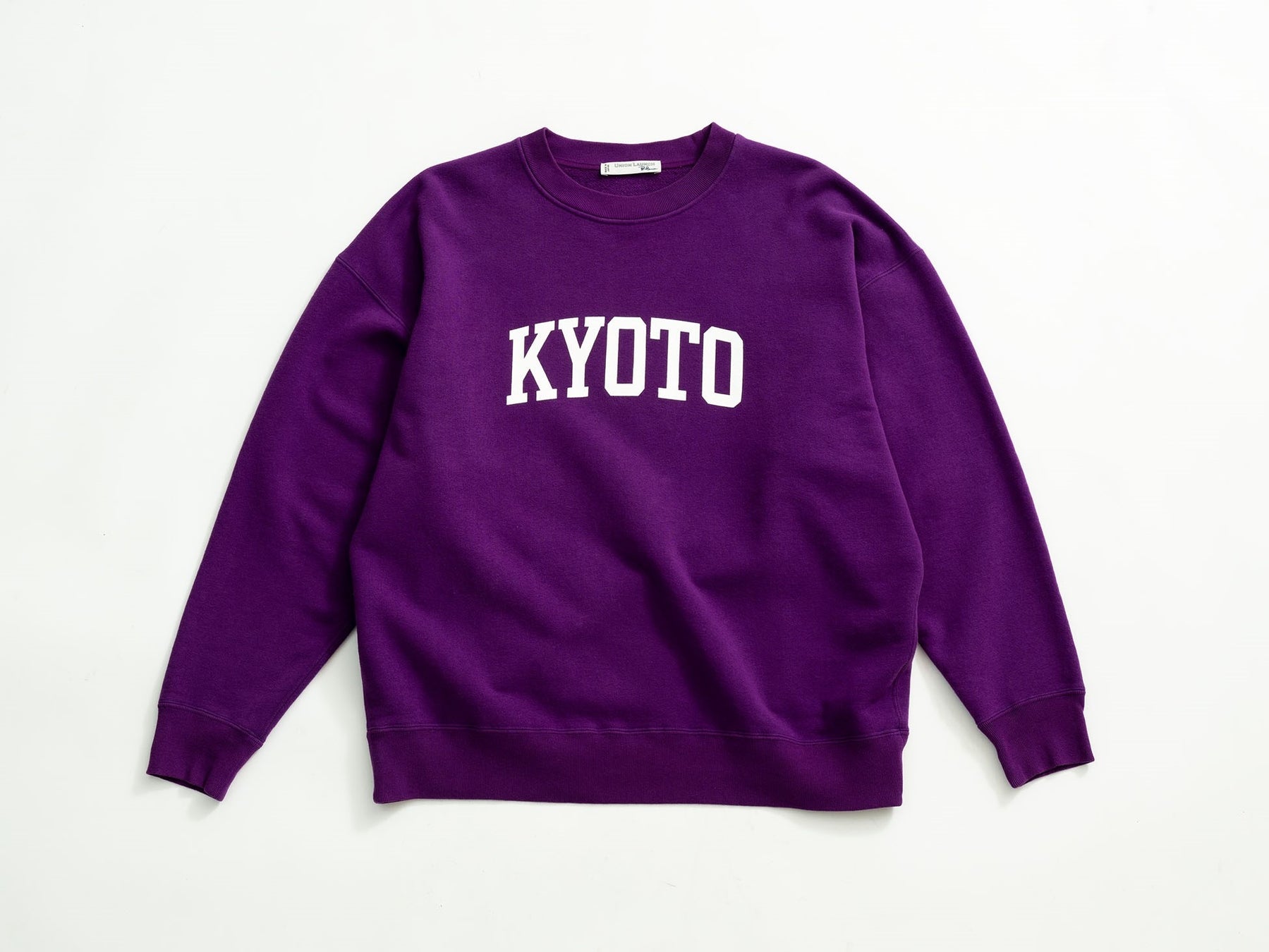 以前からご好評いただいているロンハーマン別注のクルーネックスウェットをベースに、ボタニカルダイで紫に染めた一着。京紫をインスピレーション元にしたボディカラーに、ユニオンランチらしいカレッジスタイルのロゴをプリントした、シンプルで存在感のあるスウェットです。