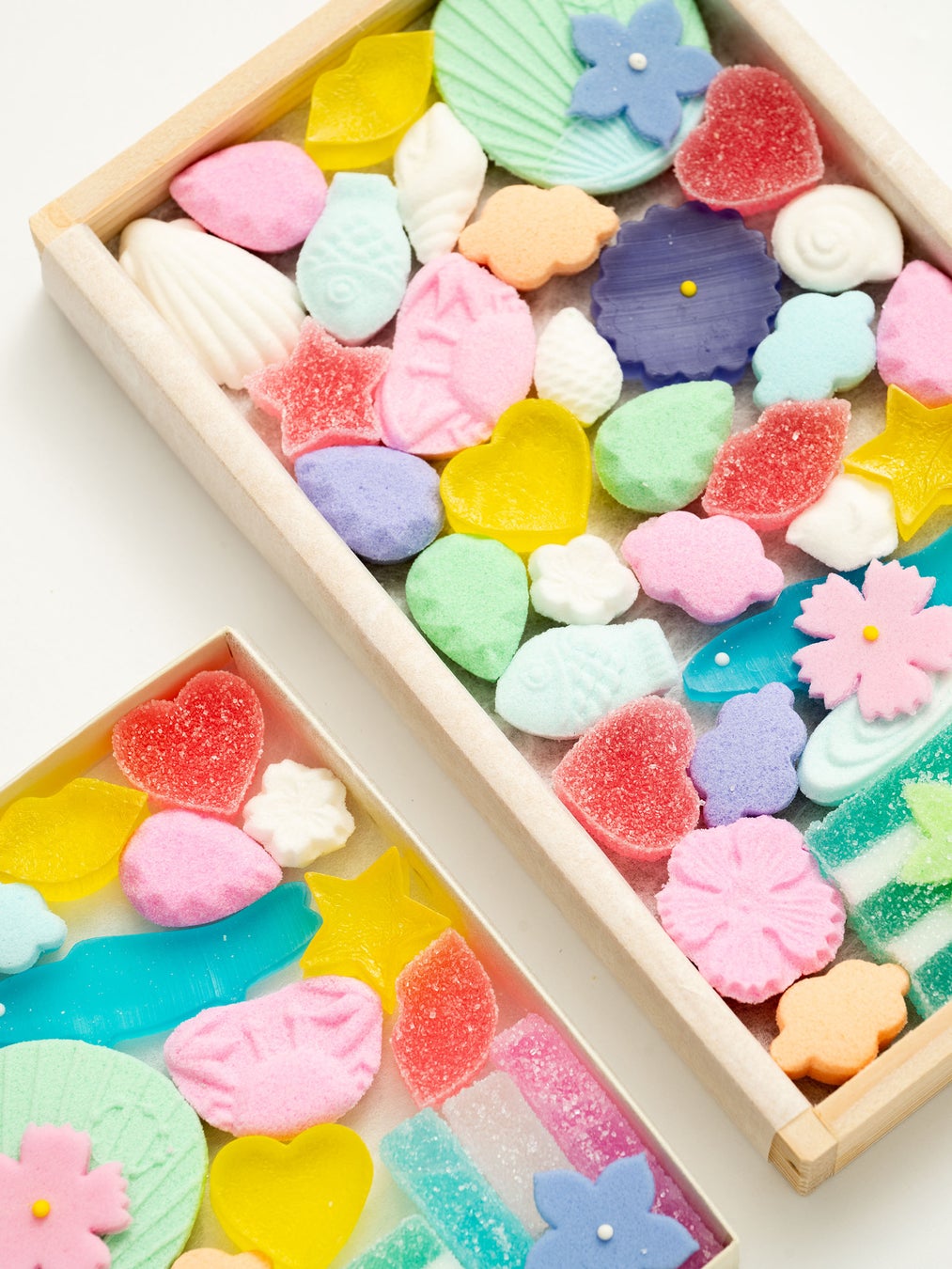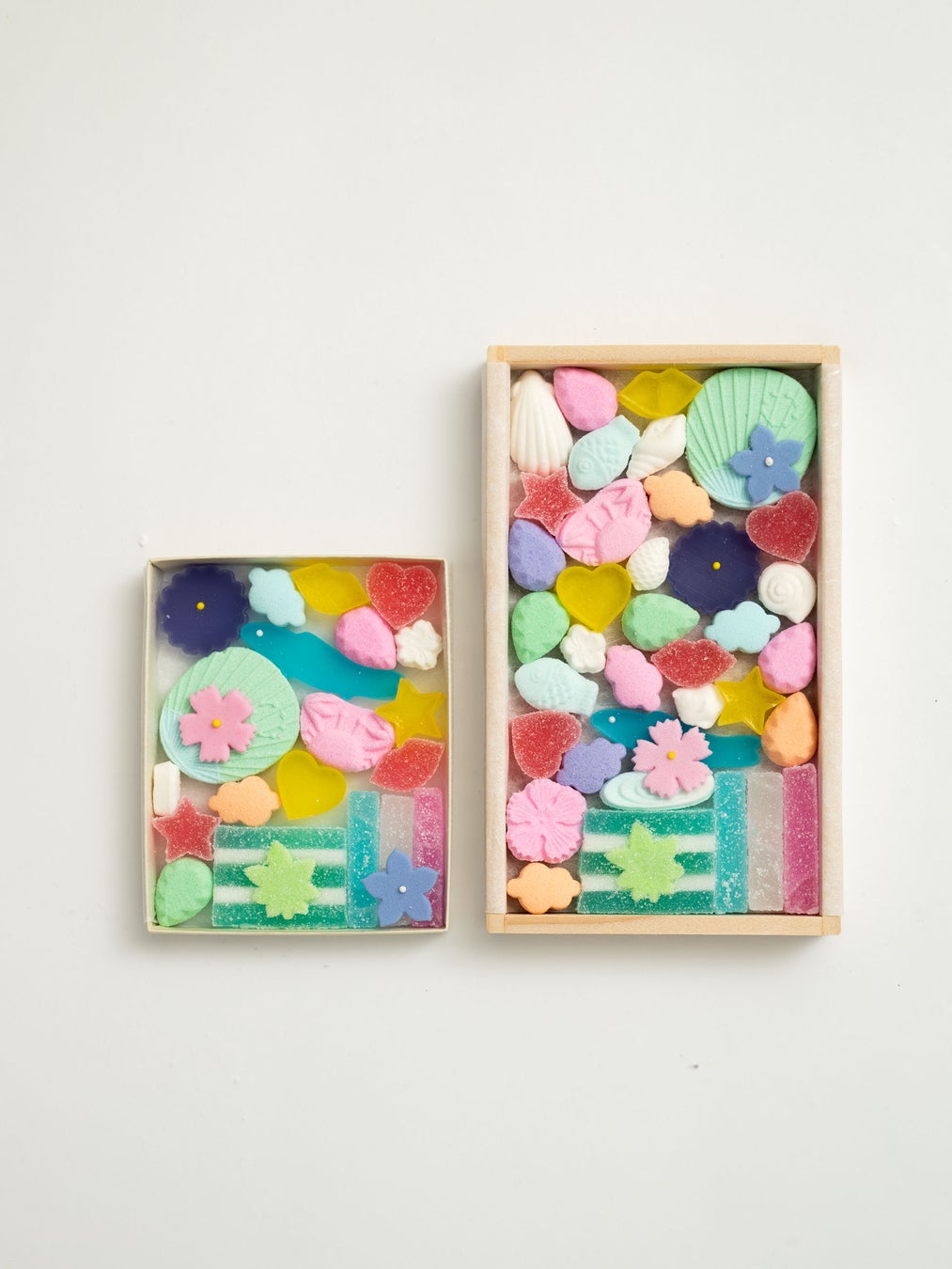日本の美意識とMarie-Hélène de Taillacの遊び心が響き合い、夢のようなひと箱が完成しました。淡い色合いの雲や宝石をかたどった落雁、発色豊かなゼリーや琥珀で表現された唇、星、ハートなど——すべてがこのコラボレーションのために、職人の手で一つひとつ丁寧に、特別に仕立てられています。 和と洋、伝統と遊び心――。三者それぞれの想いが詰まった、小さな宝物のようなお菓子をぜひご堪能ください。