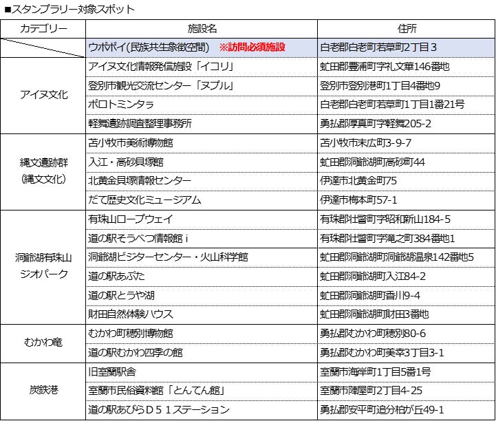 この「いぶり五大遺産」に関連した施設を巡っていただき、「ウポポイ(民族共生象徴空間)」を含む5施設以上のスタンプを集めて応募すると抽選で素敵な賞品を贈呈いたします。