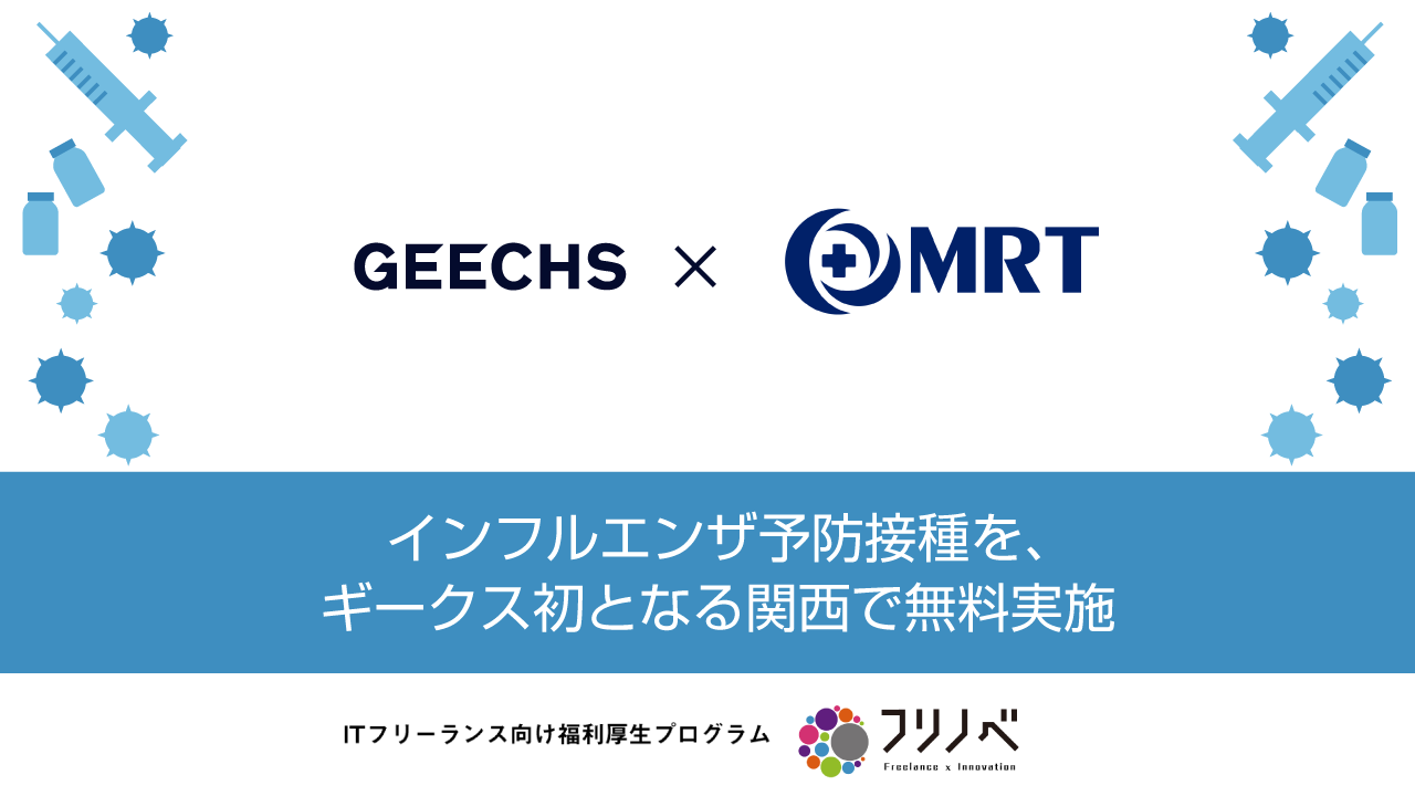 ギークス株式会社(本社:東京都渋谷区、代表取締役CEO:曽根原 稔人、以下ギークス)は、ITフリーランスの健康管理サポートを目的に、インフルエンザ予防接種を無料で実施することをお知らせします。関西での実施は今回が初めてとなります。今後もITフリーランス向け福利厚生プログラム「フリノベ」のサービス拡充などを通じ、ITフリーランスの方が安心して長く働ける環境構築を目指し、その活躍を後押ししていきます。