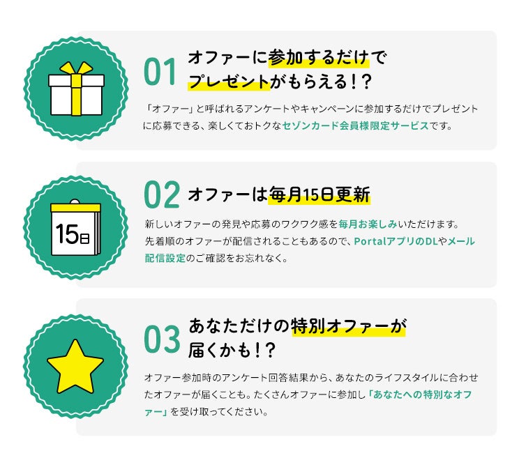 日頃のセゾンカードのご利用に感謝の気持ちを込めてご提供する、セゾンカード会員様限定でご利用いただけるサービスです。オファーと呼ばれるアンケートやキャンペーンに参加、プレゼントに応募いただくことができます。いつもご利用されるショップ等でのカードご利用でもらえるプレゼントもご用意しておりますので、ぜひご参加ください。