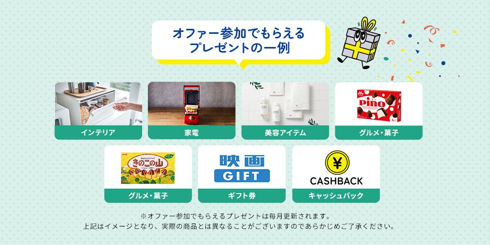 オファーは毎月15日に更新、オファー参加でもらえるプレゼントには「家電」「インテリア」「美容アイテム」「グルメ・お菓子」「キャッシュバック」「ギフト券」など、毎日の生活をちょっとHappyにしてくれるような素敵なプレゼントを多数ご用意しています。