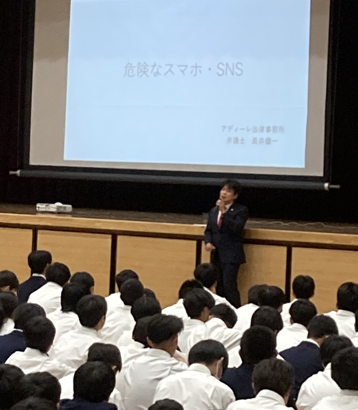 SNSなどを使用したいじめや誹謗中傷の投稿など、子どもにとってもスマホに起因するトラブルは身近なものになってきています。今回は奈良県立王寺工業高等学校より講演会の依頼を受け、全学年の生徒を対象に実施しました。アディーレの長井健一弁護士がスマホやインターネットを正しく、安全に使うために気をつけるべきことの解説や、実際にあったトラブル事例などを法的な視点を交えて話しました。