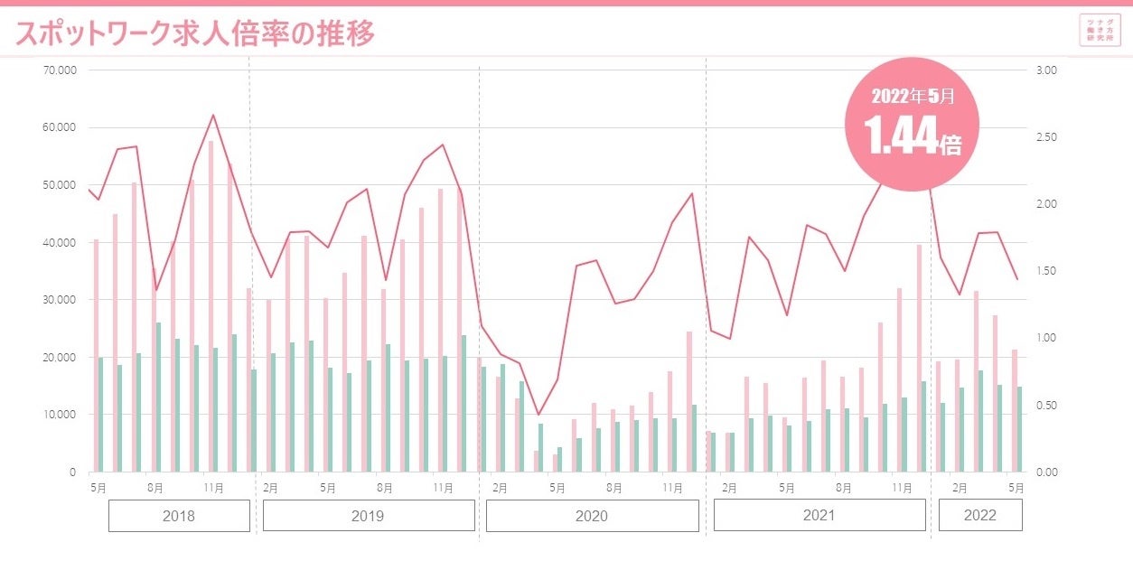 1.単発、短時間、短期間で働くスポットワークの2022年5月度求人倍率は1.44倍