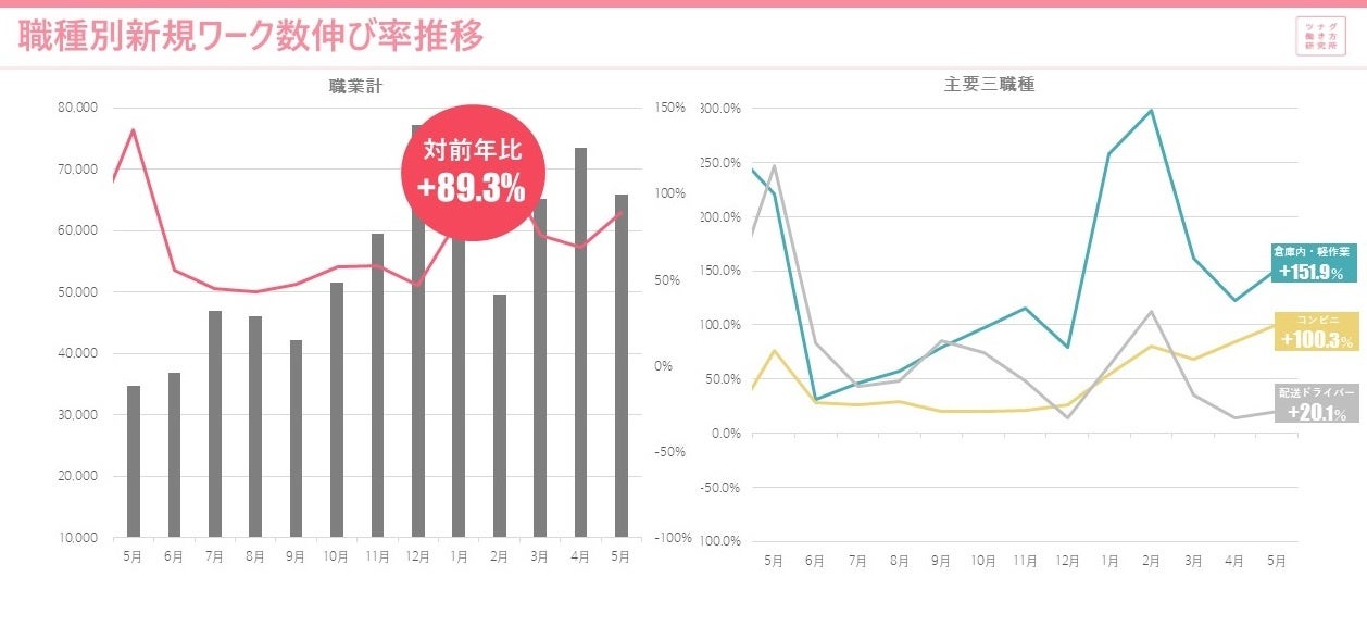 2.新規ワーク数は対前年比で+89.3%。主要職種では倉庫内・軽作業が+151.9%で大きく伸長
