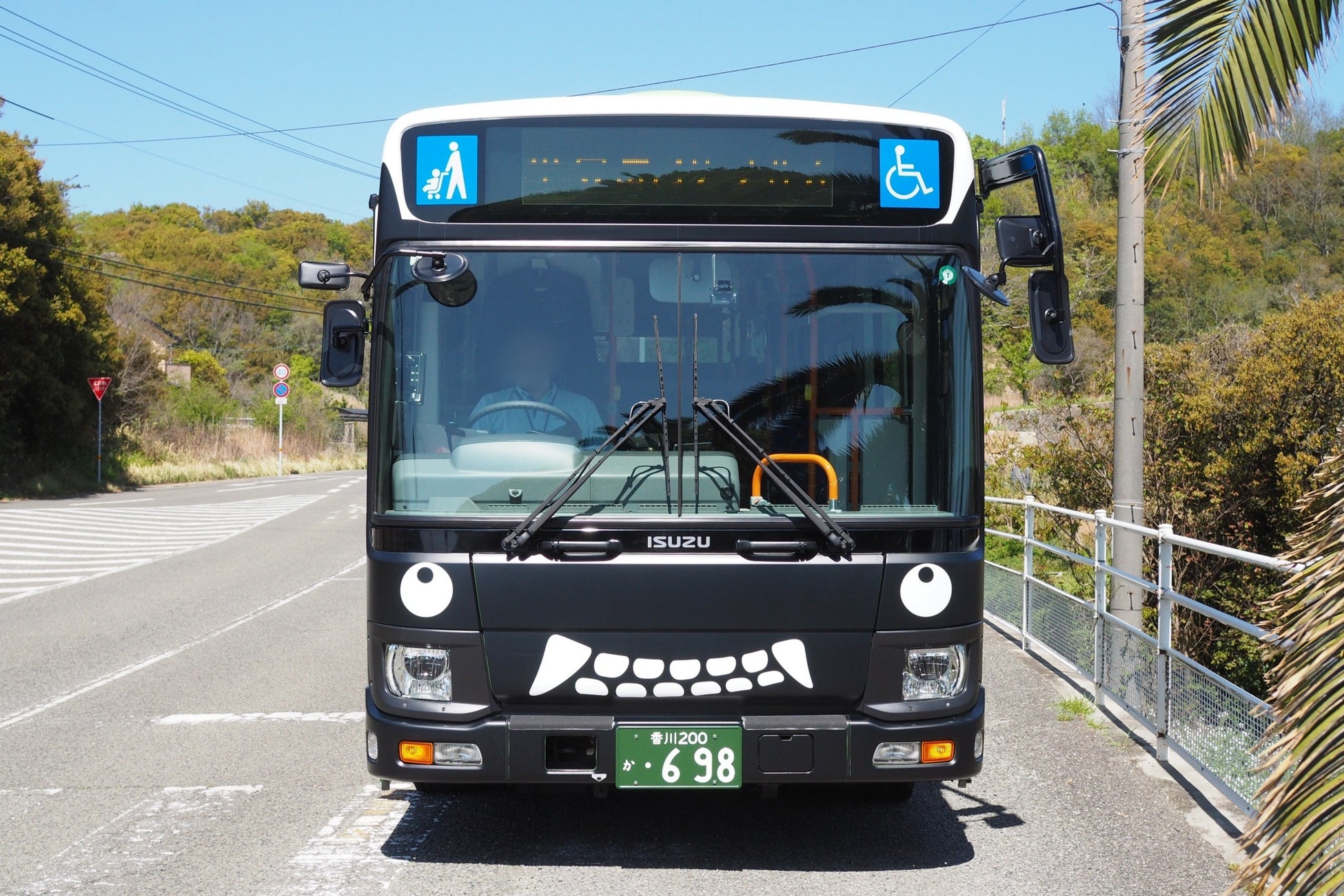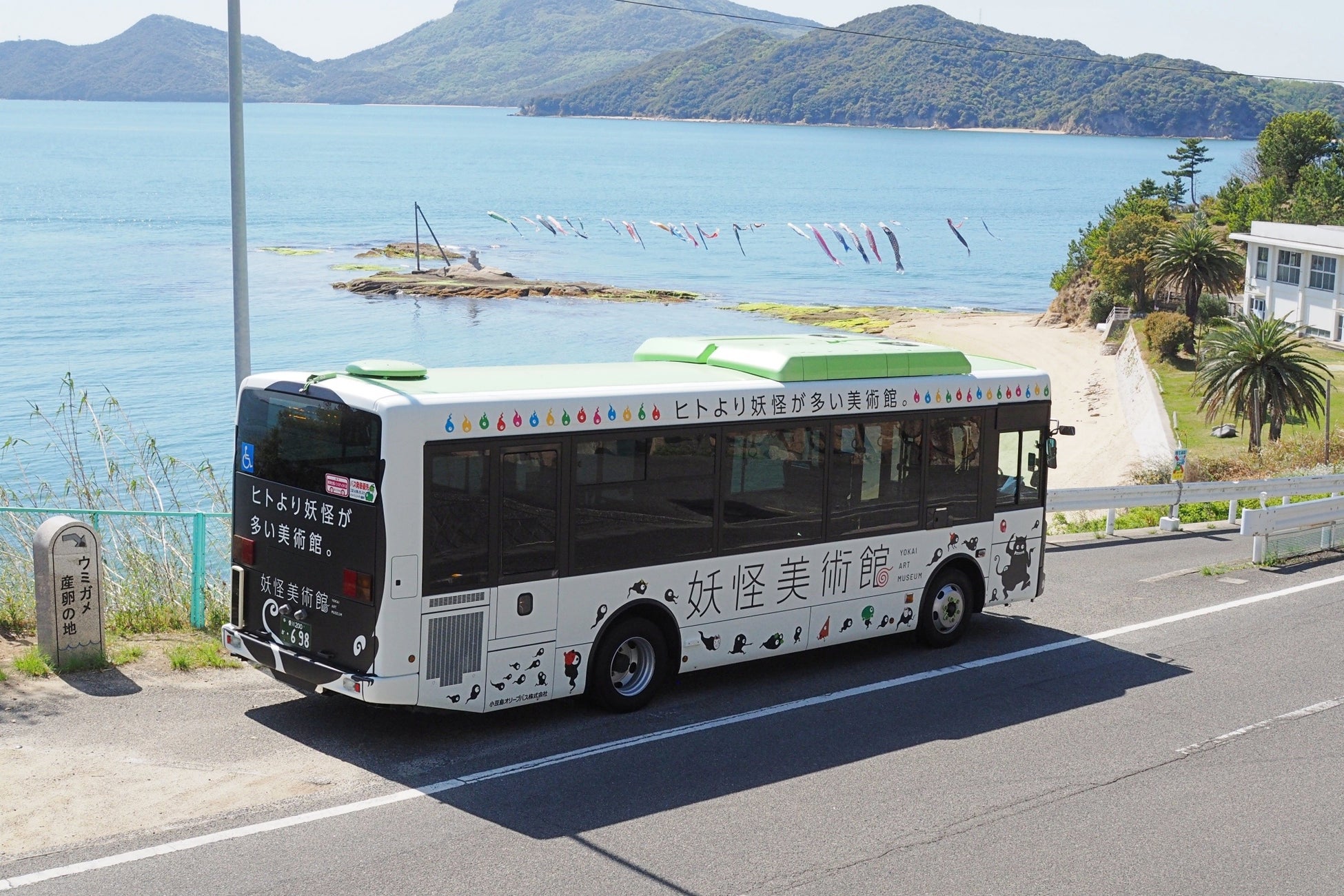 妖怪美術館のキャラクター「みちしるべぇ」のバスが島中を走ります