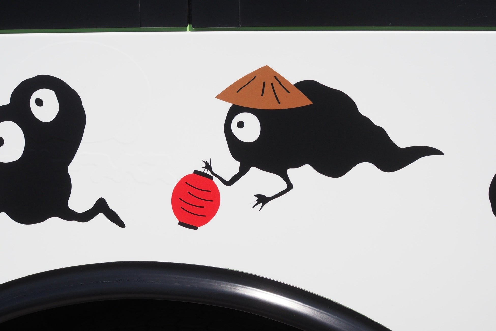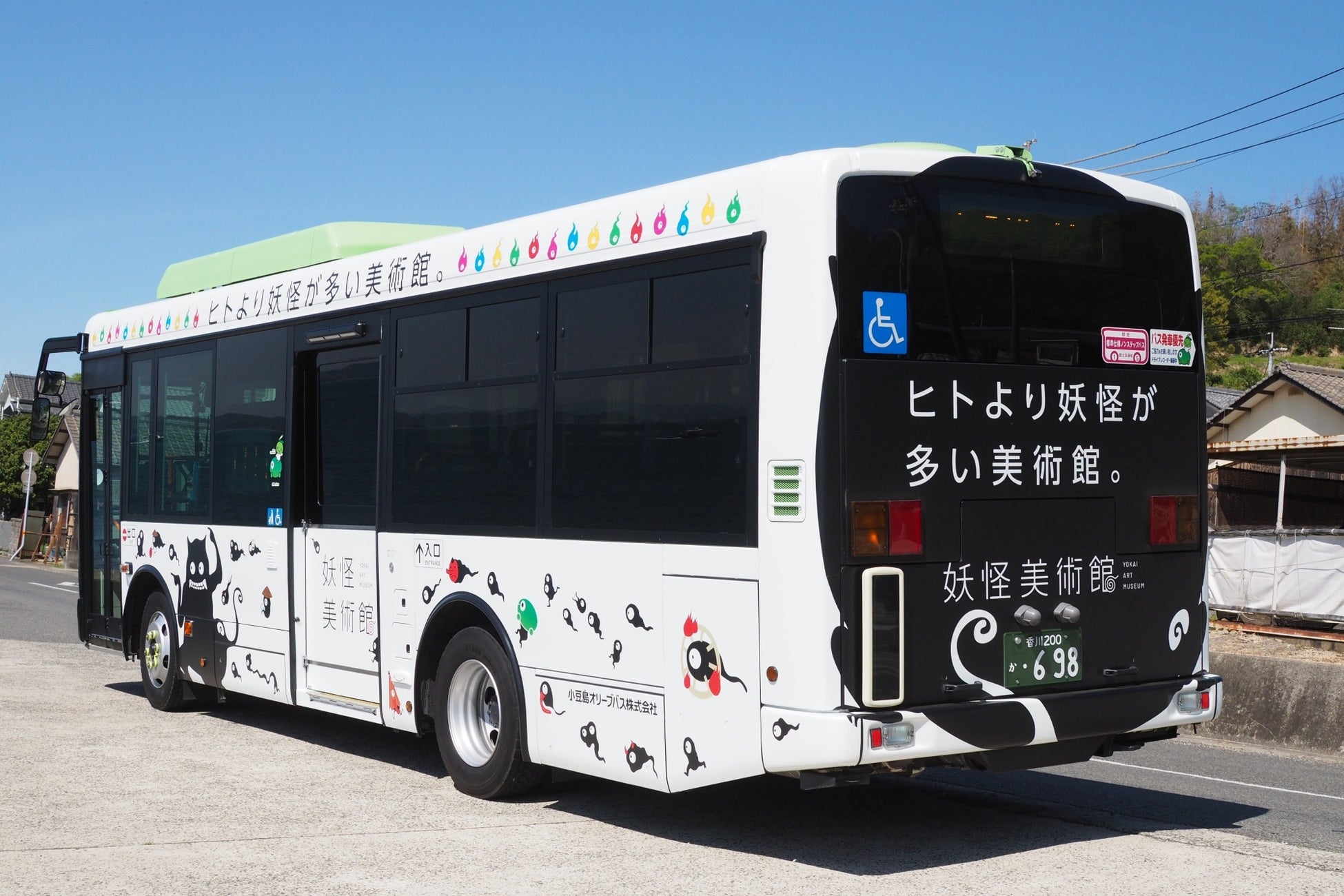 香川県・小豆島の「迷路のまち」(土庄本町)の妖怪美術館(小豆島ヘルシーランド株式会社)は、妖怪美術館のキャラクター「みちしるべぇ」のラッピングバスを瀬戸内国際芸術祭開催に合わせて運行をスタート。この車両は1台のみですが、路線バスとしてランダムに小豆島中の路線で運行。会期外と会期終了後も、小豆島オリーブバス株式会社の通常車両として使用されます。