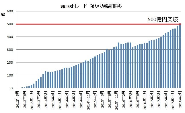 SBI FXトレード株式会社(URL:https://www.sbifxt.co.jp/、本社:東京都港区、代表取締役社長:高橋 直也、以下「当社」という)は、FX取引における預かり残高が、2018年2月20日時点で500億円を突破いたしましたのでお知らせいたします。