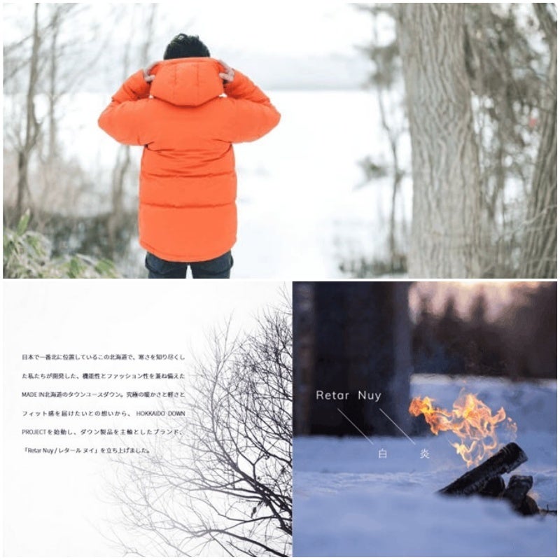日本で一番北に位置する北海道にて寒さを知り尽くしたメンバーが開発しています。ブランド名であるRetar Nuyは、北海道の先住民族であるアイヌ語を用いた造語で、「Retar=白」「Nuy=炎」を表し、寒い冬を暖かく過ごせるようにとの想いを込めています。