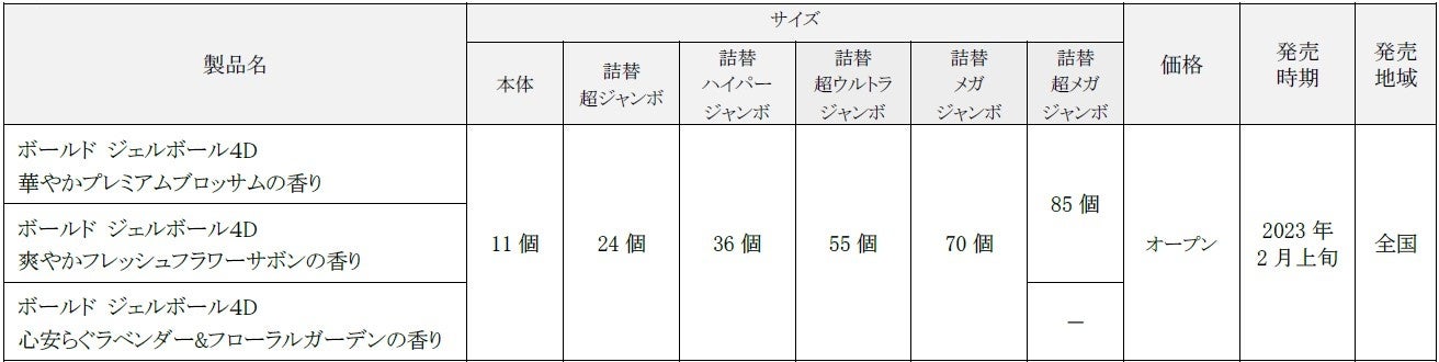 ジェルボールは、2014年に粉末、液体洗剤につづく第3の洗剤として市場に登場し、1粒を指でつまんで洗濯機に入れるだけという簡便性から、発売当初より好評をいただいております。2022年2月には、洗浄成分の働きを活性化する“強洗浄”機能や、柔軟剤なしでも柔軟効果を発揮するなど、“1粒で究極パーフェクト”の「ボールド ジェルボール4D」を発売。同年10月には、100%新鮮な花のエッセンスを配合*3し、心やすらぐ洗練された香りが特長の新香調「ラベンダー&フローラルガーデンの香り」を新たなラインアップに加え、消費者の幅広い香りのニーズに対応しました。