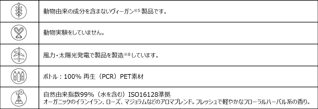 ※8 製品の製造には、(米国の)再生可能エネルギークレジットやカーボンオフセットを通じてアヴェダの太陽電池や風力エネルギーによる電力が供給されています。更に、2021年末までに工場施設において、ULスキームによるごみ廃棄場のシルバー ゼロ ウェイスト認証を取得できるよう取り組んでいます。また、美容業界において、100%再生(PCR)PETパッケージを採用したパイオニア的存在です。