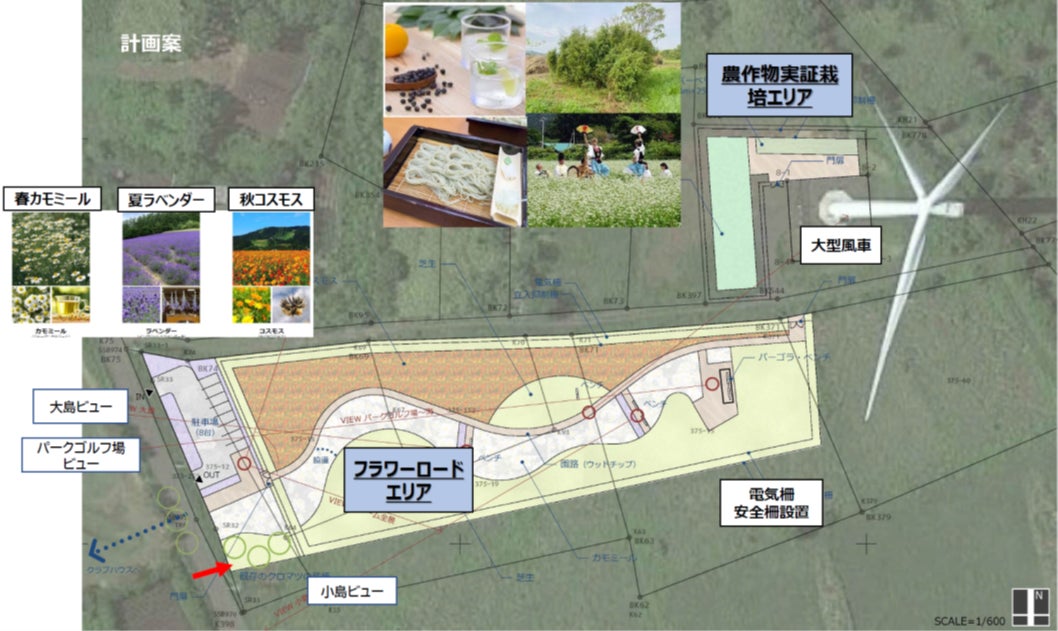 本園の開発にあたっては、当社グループの造園会社である株式会社石勝エクステリアが設計を担当し、「大型風車に続く花と緑の丘の小径」、「丘の上から望む緑と海の景色」を印象的に楽しめるランドスケープデザインとしました。また、「地域と育むファーム」をコンセプトに、大型風車の足元用地を農業によって有効活用することを目指して、蕎麦とジュニパーベリーを育てる農作物実証栽培エリアを設置し、大型風車に続くフラワーロードエリアではカモミール、ラベンダー、コスモスの栽培に取組んでおり、現在は約6万本のコスモスが見ごろを迎えております。