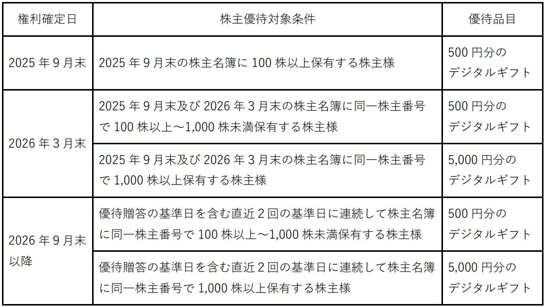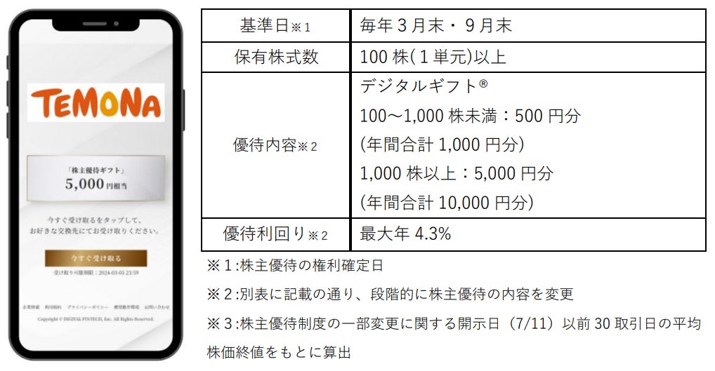 テモナ株式会社(代表取締役社長:佐川 隼人、東証スタンダード市場:証券コード3985)において、株式会社デジタルプラス(代表取締役社長:菊池 誠晃、本社:東京都渋谷区、東証グロース市場:証券コード3691)の子会社である、株式会社デジタルフィンテック(代表取締役社長:菊池 誠晃、本社:北海道札幌市)が運営する「デジタルギフト®」を株主優待としてご活用いただくことになりました。