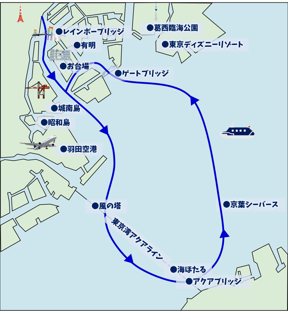 このクルーズは、航空機の技術を応用した船舶・高速ジェット船にて、レインボーブリッジやアクアブリッジ、ゲートブリッジをくぐる他、普段見ることのない羽田空港を沖から眺めたり、海ほたる沖、京葉シーバース沖、東京ディズニーリゾート沖など、東京湾の見どころを時速80キロで航行いたします。さらに船内ではMCが乗船し、各所の案内や東京湾を運航する船の紹介などを行い、高速ジェット船ならではの快適なクルーズをお届けいたします。