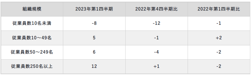 - 2023年第1四半期 組織規模別:小規模組織のみ減員予測