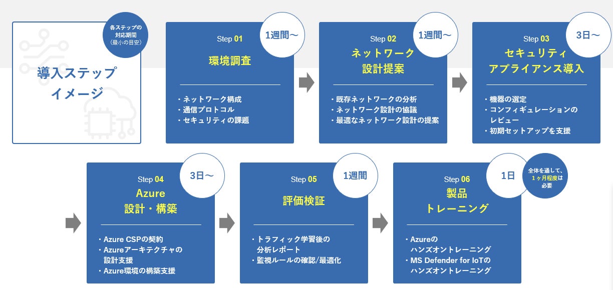 「Microsoft Defender for IoT導入支援サービス」はOTネットワークに対するセキュリティ対策を導入するためのサービスで、既存の工場ネットワーク構成や通信プロトコルなどの環境調査を最初に行い、最適なネットワーク設計の提案からMicrosoft Defender for IoTの導入および評価検証までの各種設定を、ハンズオントレーニングを含めて最短1か月で提供します。