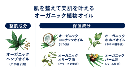 水、ヤシ油*†、水酸化K、パーム核油*†、 オリーブ果実油*†、香料※、アサ種子油*、 ホホバ種子油*、クエン酸、トコフェロール *オーガニック成分 †フェアトレード認定成分 ※天然精油