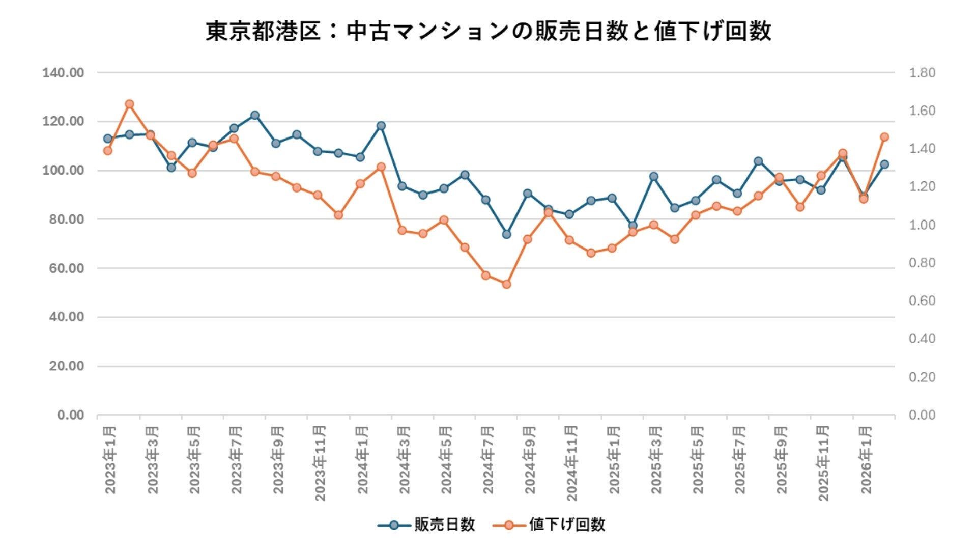 一方で、東京都港区においては、販売日数および値下げ回数がともに上昇傾向にあり、従来と比較して「売れにくさ」が顕在化しています。