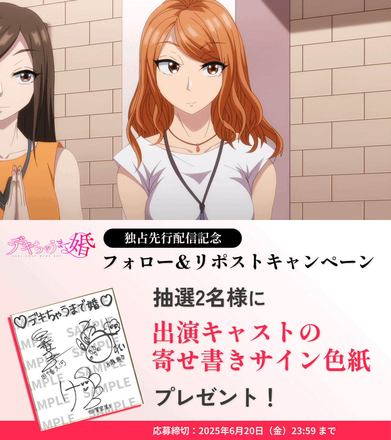 キャンペーン期間中、AnimeFesta公式Xアカウント(@AnimeFesta_Info)をフォローし、対象の投稿をリポストしていただいた方の中から抽選で2名の方に、出演キャスト(因幡大河役:白井圭さん、片瀬絢乃役:加々美澪さん、加賀宮美々役:百合本花さん)の寄せ書きサイン色紙をプレゼントします。