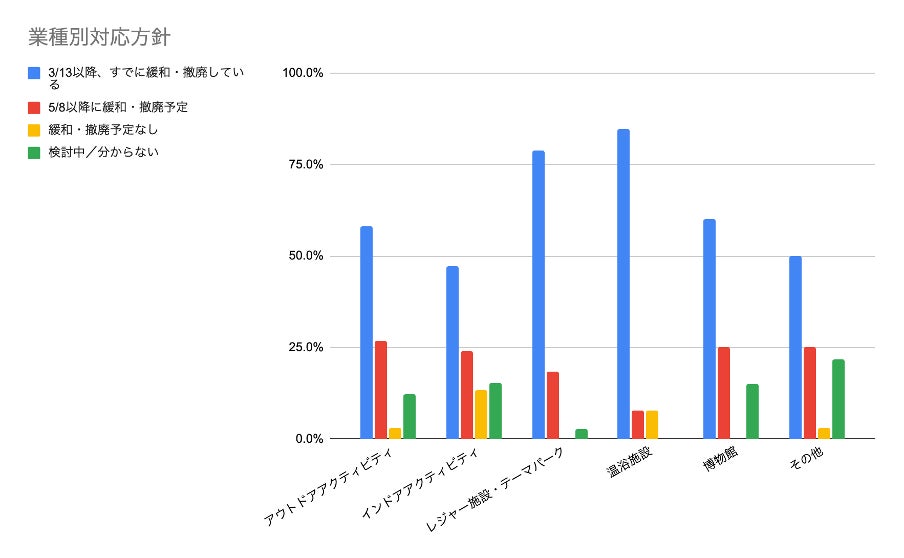 業種に問わず、「3/13以降、すでに緩和・撤廃している」の回答が最も割合を占める結果となりました。インドアアクティビティは、ほかの業種と比べて「緩和・撤廃の予定なし」が高い傾向がありました。