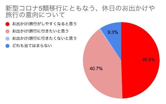 5類移行に伴なった休日の外出・おでかけ意向の変化について、「お出かけがしやすくなる」という回答が全体の半分を占める49%、「嬉しい」が次いで33.1%という結果になり、合わせて8割以上の回答にお出かけ意欲の高まりが現れる結果となりました。