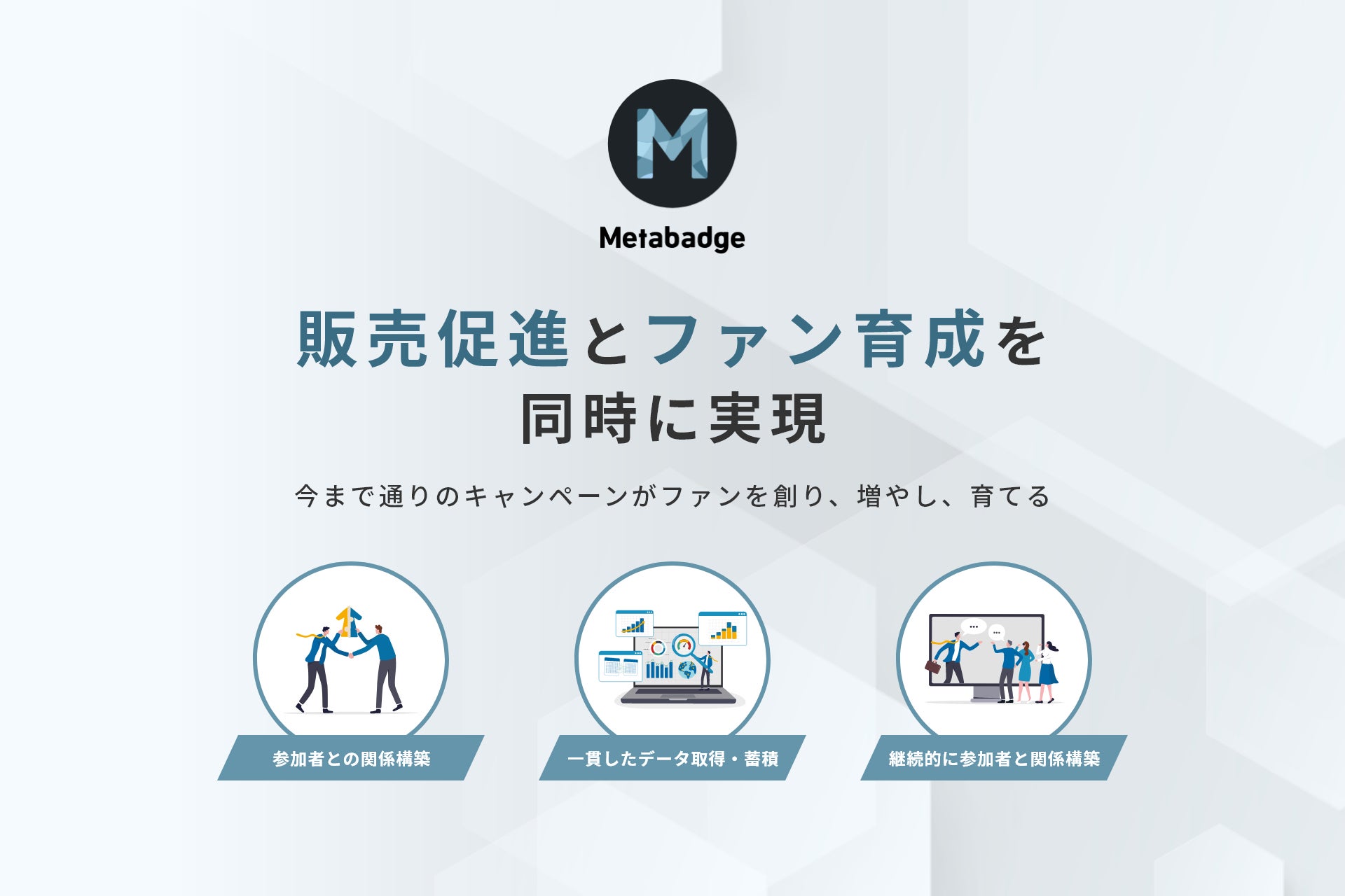 『Metabadge』は、”販売促進”と”ファン育成”を同時に実施できるファンマーケティングツールです。今まで単発化していた1つ1つのキャンペーンを繋ぎ合わせることで、新規ユーザーへの認知拡大のみならず、既存ユーザーとの関係構築を同時に進め、自社ブランドのファンを増やします。