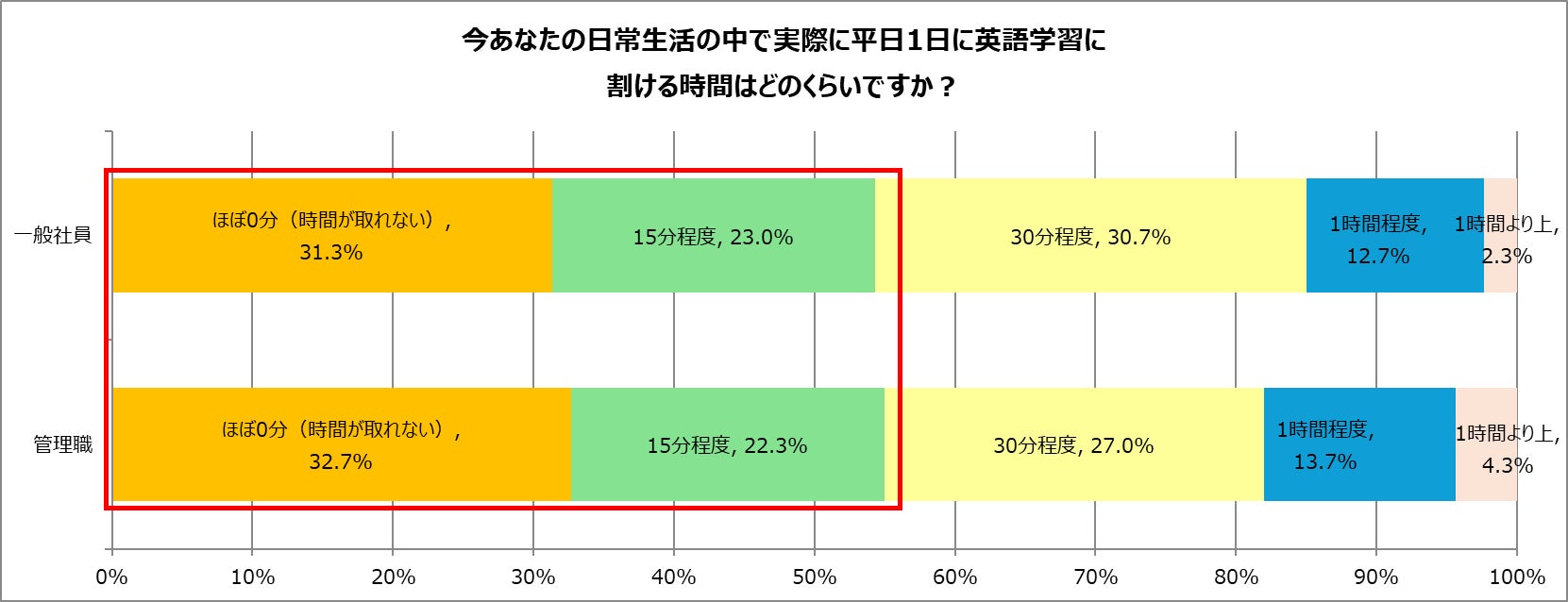 ▼英語学習に割ける時間「ほぼゼロ」。一般社員31.3%、管理職32.7%。意欲と行動にギャップ
