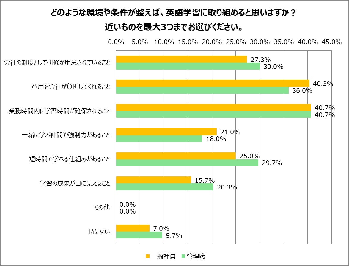 どのような環境や条件が整えば英語学習に取り組めるかを聞いたところ、一般社員・管理職ともに「業務時間内に学習時間が確保されること」が40.7%で最多となりました。次いで、一般社員は「費用を会社が負担してくれること」が40.3%、管理職も同項目が36.0%と高い水準でした。さらに「会社の制度として研修が用意されていること」も一般社員27.3%、管理職30.0%と、上位3項目はいずれも会社の制度的な支援に関するものが占めています。