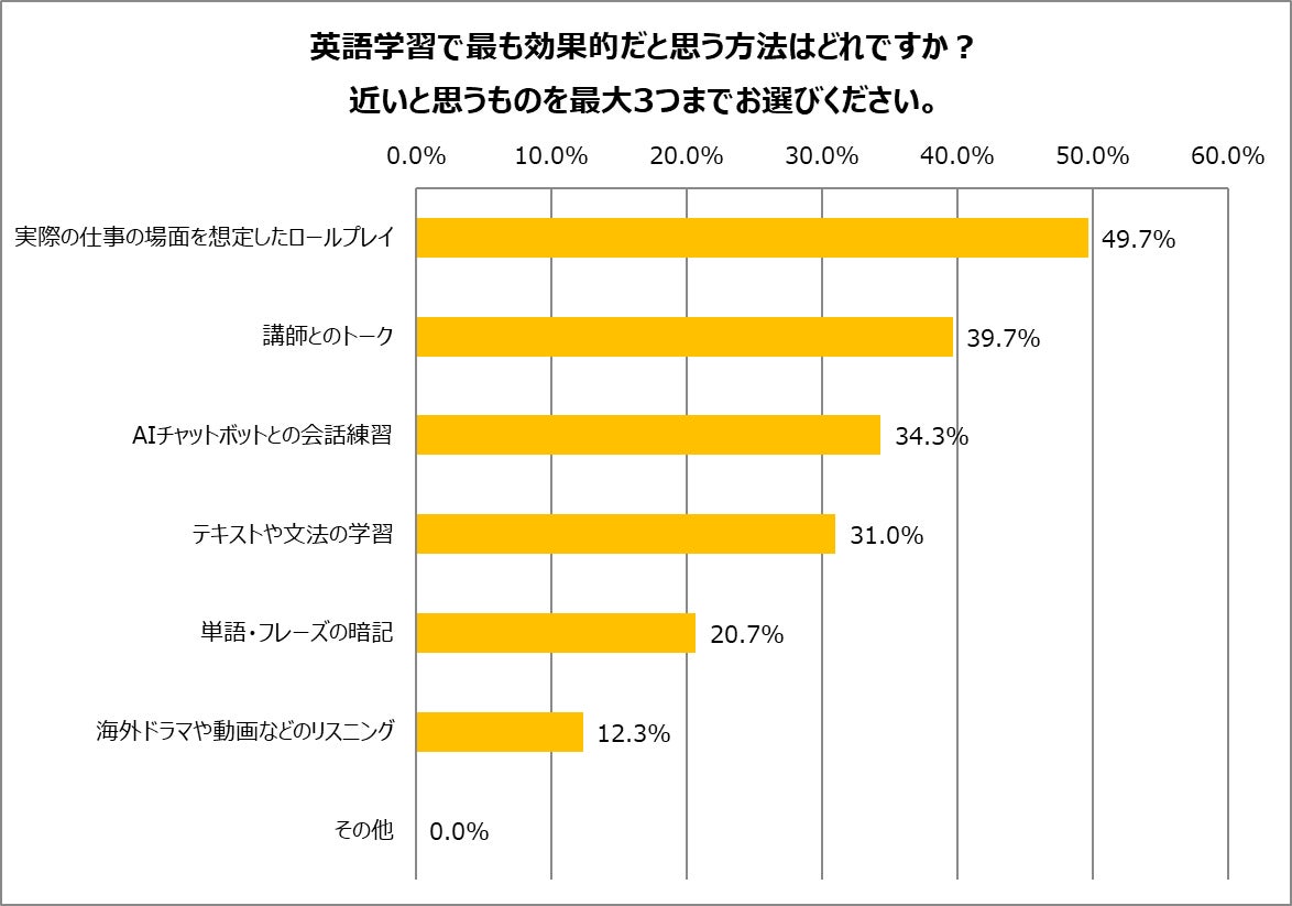 これら課題を克服するために、効果的な学習法として両世代から高い支持を集めたのは、「講師とのトーク」と「実際の仕事場面を想定したロールプレイ」でした。さらに、英語の会議・商談に不安・緊張を感じている層ほど「ロールプレイ」の支持率が高まる傾向もクロス集計から確認されており、実際のシチュエーションに近い環境で繰り返し実践を積むことが、不安の軽減にもつながると感じている人が多い傾向が読み取れます。