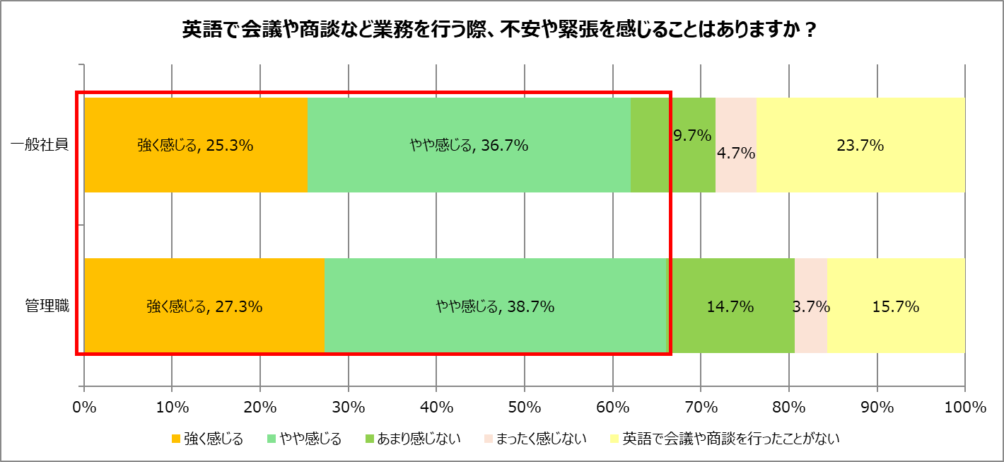 英語で会議や商談などの業務を行う際、不安や緊張を感じるかを聞いたところ、一般社員は「強く感じる」が25.3%、「やや感じる」が36.7%と、合計62.0%が不安・緊張を感じると回答。管理職も「強く感じる」が27.3%、「やや感じる」が38.7%と、合計66.0%にのぼりました。