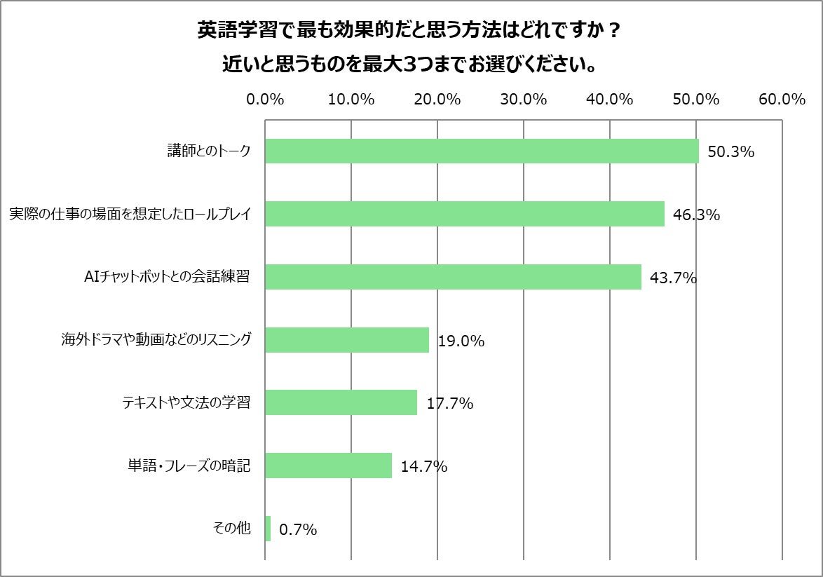 英語学習で効果的だと思う方法を聞いたところ、管理職は「講師とのトーク」が50.3%で最多となり、過半数が講師との対話を効果的と捉えています。一般社員でも同項目は39.7%で2位に入りました。