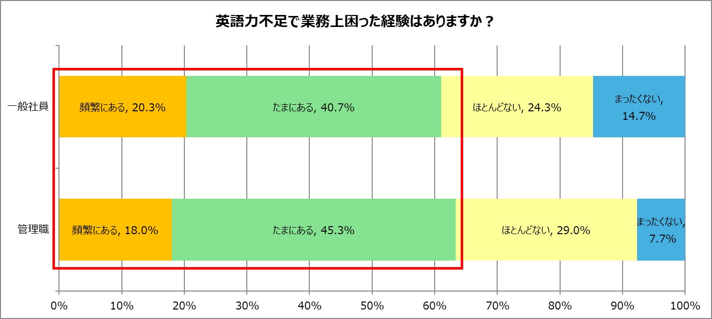 英語力不足で業務上困った経験があるかを聞いたところ、一般社員は「頻繁にある」が20.3%、「たまにある」が40.7%と、合計で61.0%が困った経験があると回答。管理職も「頻繁にある」が18.0%、「たまにある」が45.3%と、合計63.3%にのぼりました。いずれの層でも過半数が英語力に課題を感じていることが分かります。