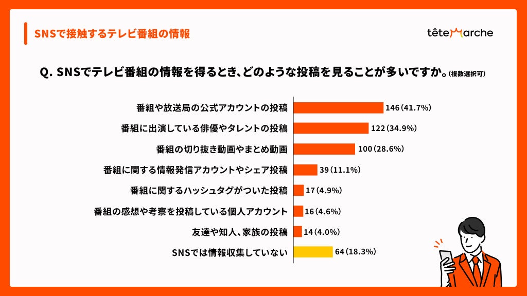 SNSでテレビ番組の情報を得るとき、多くの学生は「番組や放送局の公式アカウントの投稿(41.7%)」 や「番組出演者の投稿(34.9%)」といった公式情報を見ています。しかし、「切り抜き動画(28.6%)」も無視できない存在となっています。