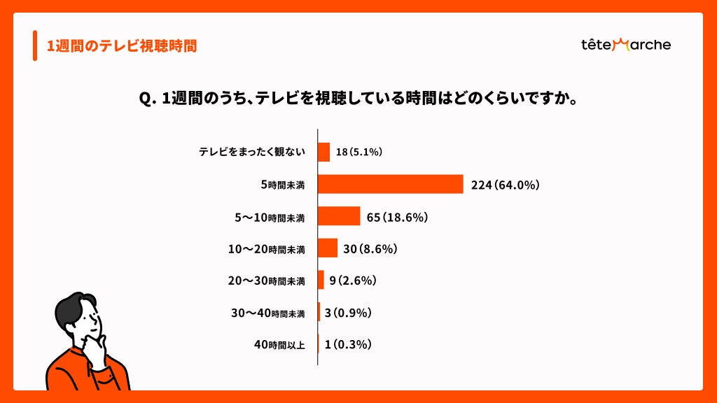 アンケートで「1週間のうち、テレビを視聴している時間はどのくらいですか」と尋ねたところ、最も多かった回答は「5時間未満(64.0%)」でした。さらに「テレビをまったく観ない(5.1%)」も合わせると、週5時間未満の視聴が回答者全体の約7割を占めます。
