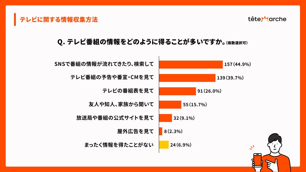 テレビ番組の情報収集方法として「SNSで流れてきたり、検索して(44.9%)」が回答者全体のトップとなり、SNSがテレビ視聴の主要なきっかけとなっていることが明らかになりました。