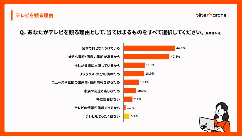 最も多い視聴理由は「習慣で何となく」。一方で、好きな番組や「推し」の出演といった明確な目的を持った視聴も存在する。