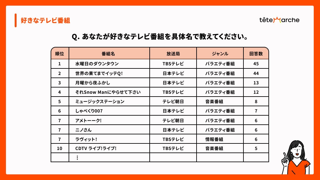 特に人気の番組である「水曜日のダウンタウン」や「世界の果てまでイッテQ!」が支持される理由として、アンケートの自由回答では「企画の面白さや独自性」「現場の楽しそうな雰囲気や親近感(番組制作スタッフとの絡み)」「出演者の魅力(掛け合いやツッコミ)」などが多く挙げられました。